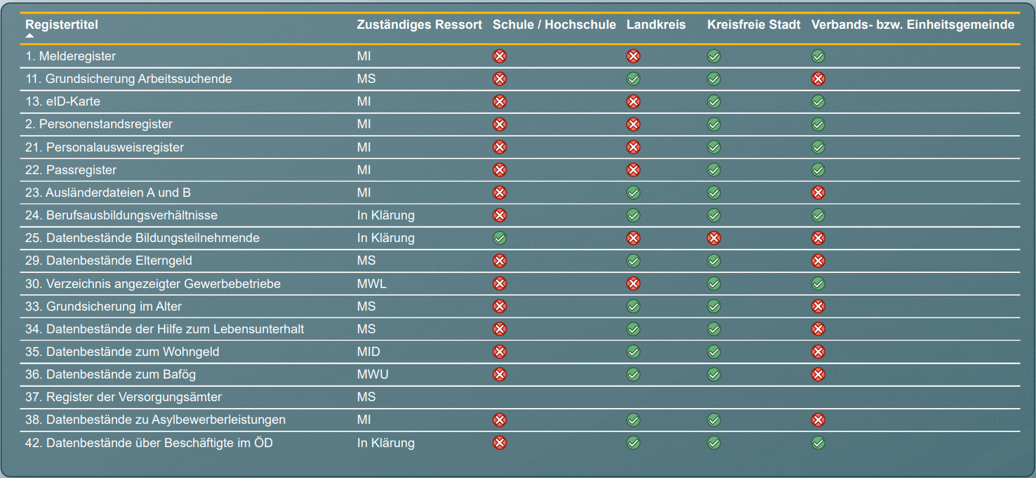 Aufbauend auf dieser bundesweiten Priorisierung erfolgt die konkrete Umsetzung in den Ländern. Die folgende Übersicht zeigt die Zuständigkeiten für die Register in Sachsen-Anhalt.